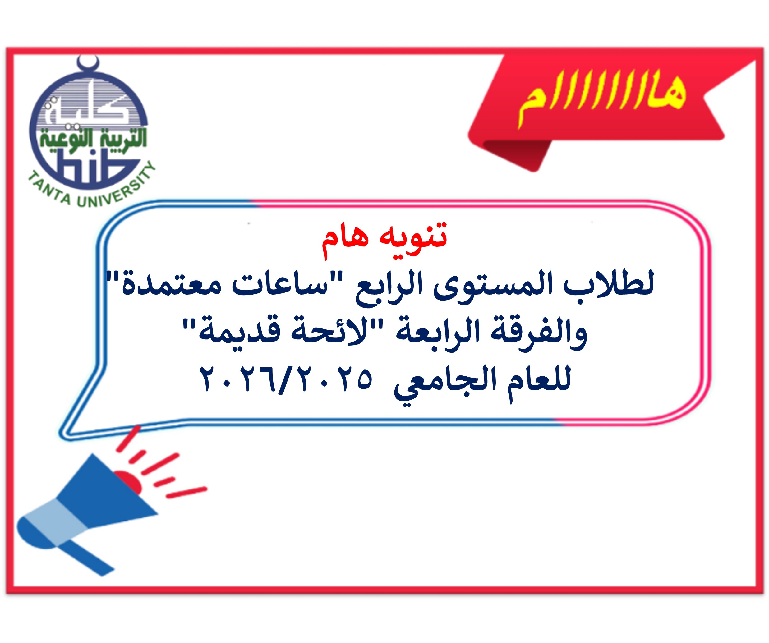 تنويه هام لطلاب المستوى الرابع "ساعات معتمدة" والفرقة الرابعة "لائحة قديمة" 2025/2026