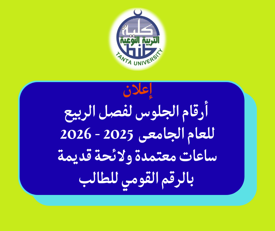 تنوه إدارة شئون التعليم والطلاب بكلية التربية النوعية جامعة طنطا، تحت رعاية أ.د رانيا عبده الإمام عميد الكلية، وأ.د إيمان ربيع وكيل الكلية لشئون التعليم والطلاب، على طلاب المستوى الرابع "ساعات معتمدة" والفرقة الرابعة "لائحة قديمة" 2025/2026