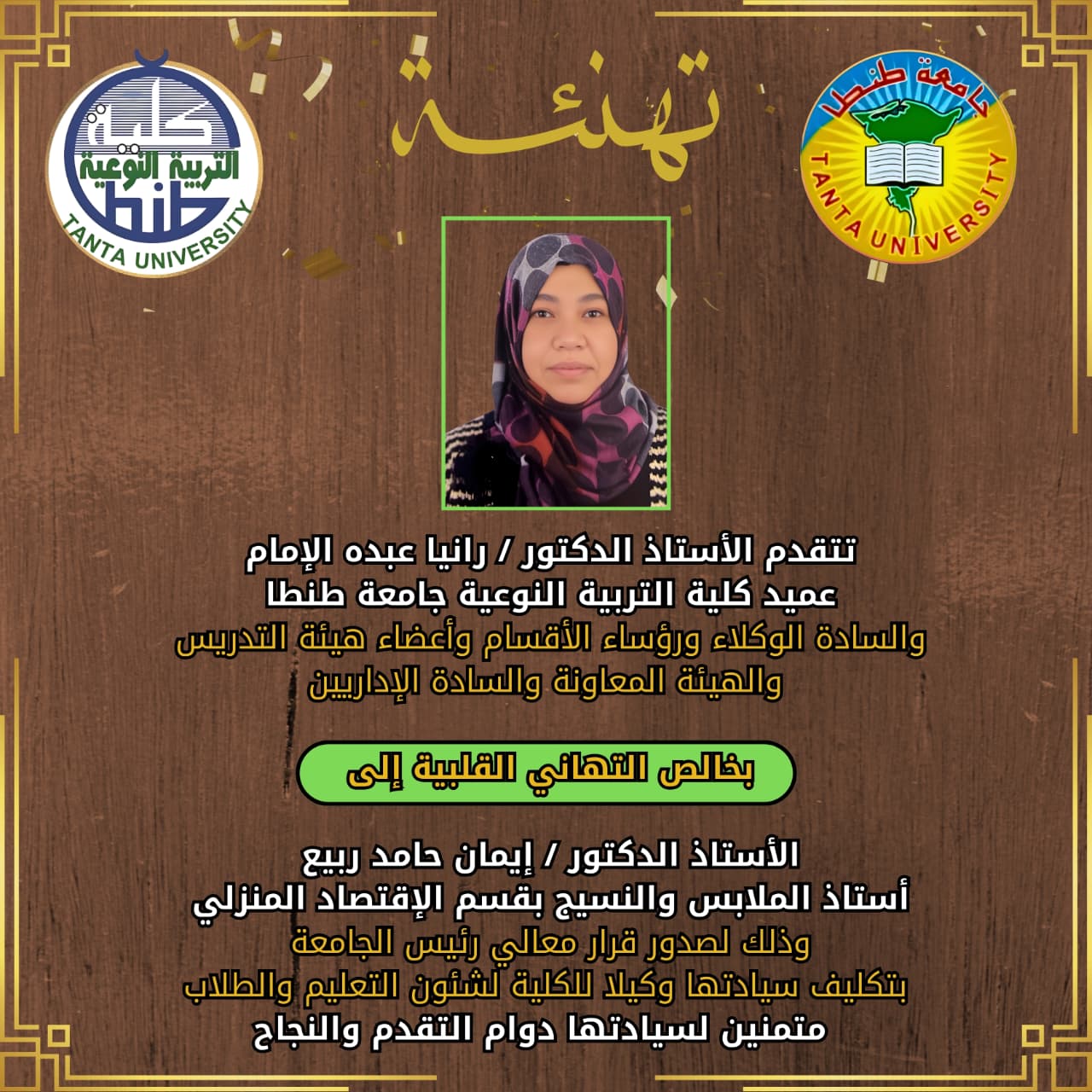 تتقدم الأستاذ الدكتور / رانيا عبده الإمام عميد كلية التربية النوعية جامعة طنطا، والسادة الوكلاء ورؤساء الأقسام وأعضاء هيئة التدريس والهيئة المعاونة والسادة الإداريين، بخالص التهاني القلبية إلى الأستاذ الدكتور / إيمان حامد ربيع أستاذ الملابس والنسيج بقسم الإقتصاد المنزلي وذلك لصدور قرار معالي رئيس الجامعة بتكليف