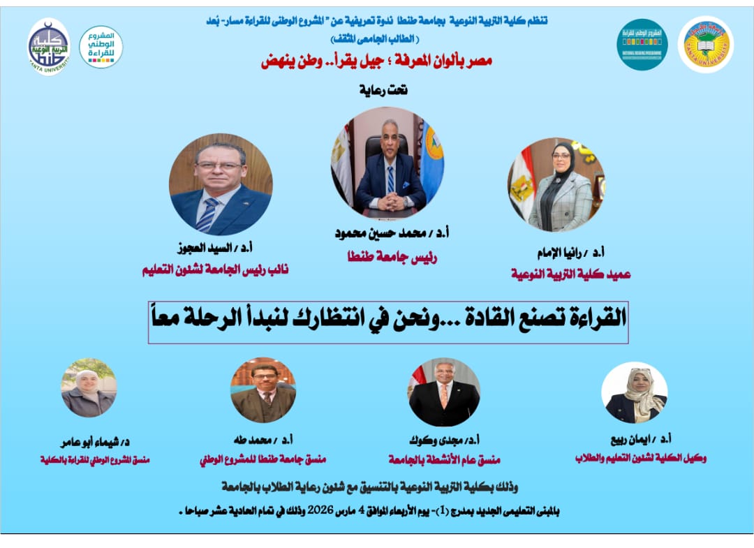 تعلن كلية التربية النوعية - جامعة طنطا عن الندوة التعريفية للمشروع الوطني للقراءة، وذلك في إطار دعم توجهات الدولة المصرية نحو بناء الإنسان وتنمية الوعي الثقافي والمعرفي لدى طلاب الجامعات، تحت شعار «جيل يقرأ… وطن ينهض»، يوم الأربعاء الموافق 4 مارس 2026 وذلك في تمام الحادية عشر صباحا بالمبنى التعليمي الجديد بمدرج (1)، برعاية الأستاذ الدكتور/ محمد حسين رئيس جامعة طنطا، والأستاذ الدكتور/ السيد العجوز نائب رئيس الجامعة لشئون التعليم والطلاب، والأستاذ الدكتور/ رانيا عبده الإمام عميد كلية التربية النوعية، والأستاذ الدكتور/ إيمان ربيع وكيل الكلية لشئون التعليم والطلاب، بالتنسيق مع الأستاذ الدكتور/ مجدي وكوك منسق عام الأنشطة الطلابية بالجامعة، والأستاذ الدكتور/ محمد طه منسق الجامعة للمشروع الوطني للقراءة، ودكتور/شيماء أبو عامر منسق المشروع بالكلية.