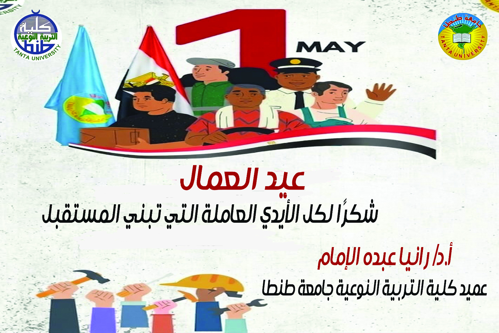 تتقدم أ.د/ رانيا الإمام " عميد كلية التربية النوعية" جامعة طنطا والسادة الوكلاء وأعضاء هيئة التدريس والهيئة المعاونة وجميع منسوبي الكلية وطلابها بخالص التحية والتقدير إلى جميع عمال مصر الذين يبذلون قصارى جهدهم لبناء