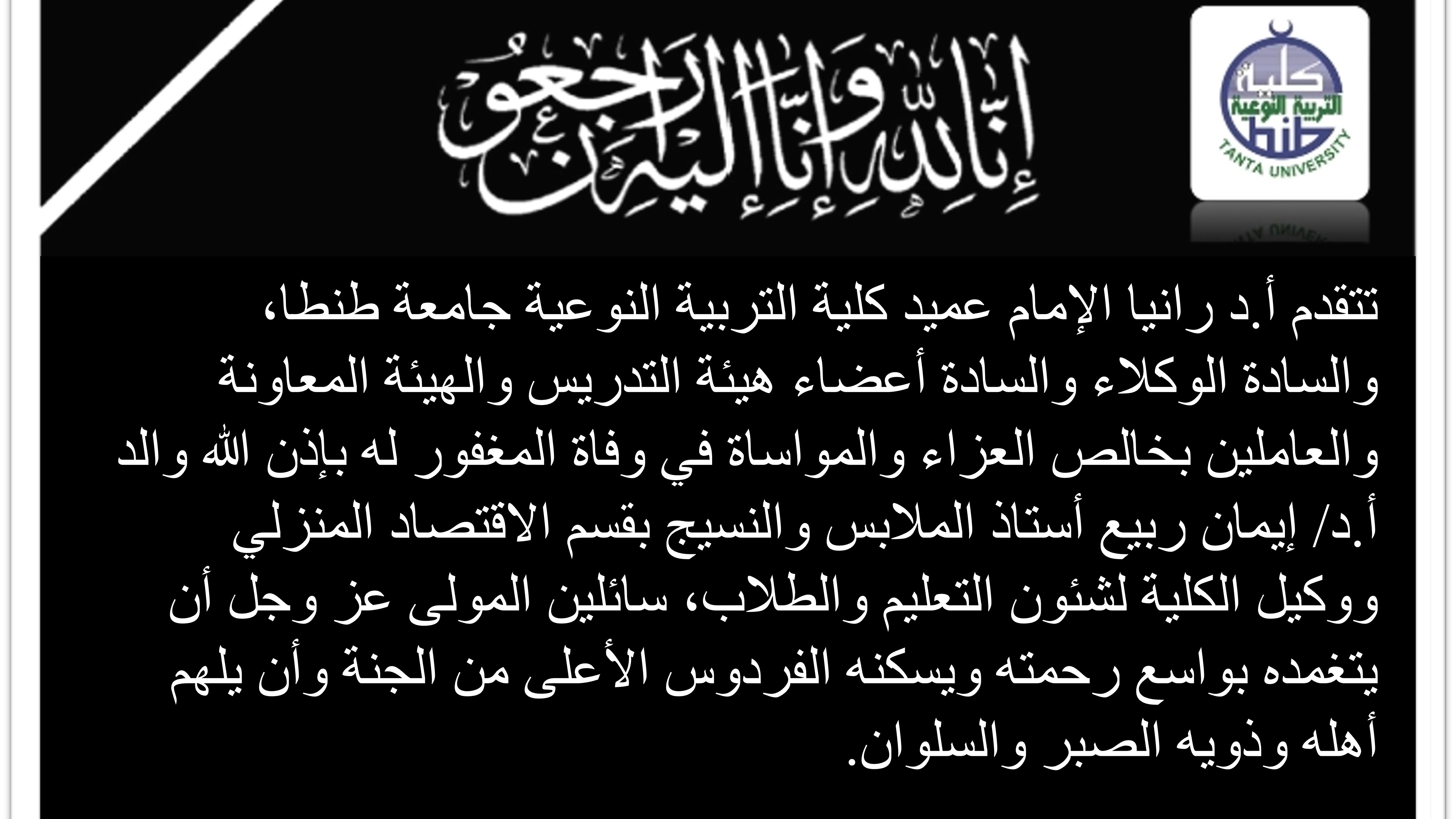 تتقدم أ.د رانيا الإمام عميد كلية التربية النوعية جامعة طنطا، والسادة الوكلاء والسادة أعضاء هيئة التدريس والهيئة المعاونة والعاملين بخالص العزاء والمواساة في وفاة المغفور له بإذن الله والد أ.د/ إيمان ربيع أستاذ الملابس والنسيج بقسم