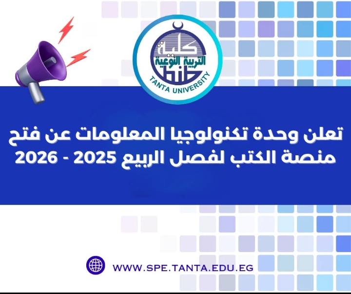 تحت رعاية أ.د/ رانيا الإمام عميد عميد كلية التربية النوعية جامعة طنطا وأ.د/ إيمان ربيع وكيل الكلية لشئون التعليم والطلاب و د/ وائل زعويل مدير وحدة تكنولوجيا المعلومات، تعلن وحدة تكنولوجيا المعلومات عن فتح منصة الكتب الالكترونية لفصل الربيع للعام الجامعى 2025-2026 جميع الشعب والمستويات الدراسية على منصة الكتب بجامعة طنطا.