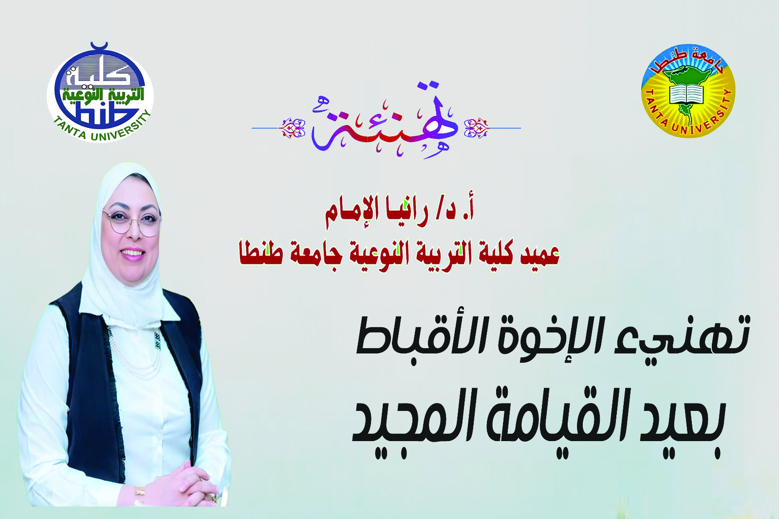 تتقدم أ.د/ رانيا الإمام "عميد كلية التربية النوعية" جامعة طنطا والسادة وكلاء الكلية وأعضاء هيئة التدريس والهيئة المعاونة والهيكل الإداري وجميع منسوبي الكلية وطلابها بخالص التهاني القلبية إلى الإخوة الأقباط بمناسبة عيد القيامة