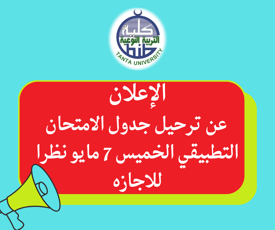 تعلن إدارة شئون التعليم والطلاب بكلية التربية النوعية جامعة طنطا عن ترحيل جدول الامتحان التطبيقي الخميس 7 مايو إلى الثلاثاء 19 مايو نظرا للاجازه