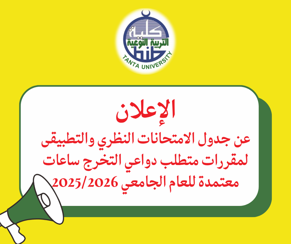 تعلن إدارة شئون التعليم والطلاب بكلية التربية النوعية جامعة طنطا عن جدول الامتحانات النظري والتطبيقى لمقررات متطلب دواعي التخرج