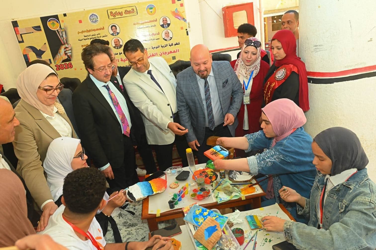 تحت رعاية أ.د/ محمد حسين "رئيس الجامعة" وأ.د/ محمود سليم " نائب رئيس الجامعة لشئون خدمة المجتمع وتنمية البيئة" وأ.د/ رانيا الإمام " عميد الكلية" وأ.د/ شريف ربيع " وكيل الكلية لشئون خدمة المجتمع وتنمية البيئة" ، وتحت شعار "معا نحو الإبداع والابتكار تفقد د/ناصر حسن "وكيل وزارة التربية والتعليم بالغربية " و د/السيد العراقي "مدير عام الشئون التنفيذية " وأ/ محمد فتوح "مدير إدارة الأمن" وأ/ السيد دنيا "موجه عام التربية الفنية "
