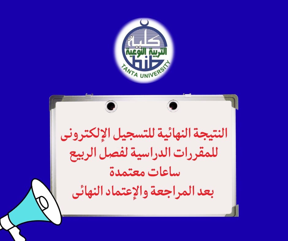 تحت رعاية ا.د/ رانيا الإمام عميد كلية التربية النوعية، وا.د/ إيمان ربيع وكيل الكلية لشئون التعليم والطلاب و د/ وائل زعويل مدير وحدة تكنولوجيا المعلومات، تعلن وحدة تكنولوجيا المعلومات نتيجة التسجيل الإلكترونى بعد المراجعة والإعتماد النهائى للمقررات الدراسية بنظام الساعات المعتمدة لفصل الربيع للعام الجامعى 2025 – 2026، وعلى طلاب المستويات الدراسية المختلفة التحقق من صحة التسجيل حيث لن يتمكن الطالب فى نهاية الفصل الدراسى من امتحان سوى المقررات المعلنه فقط لذا يرجى التحقق من: